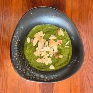 Leek, broccoli, onion, sweet potato and spinach. Topped with toasted almonds.