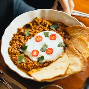 Textured soy protein, pinto beans, tomato sauce and zucchini. Served with yogurt, parsley, chili slices and tapioca crisp.