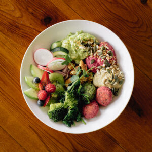 Mistura de grãos, abacate esmagado, hummus, babaganoush, espinafres salteados, brócolos, nozes, vegetais, fruta, mistura de sementes e micro vegetais