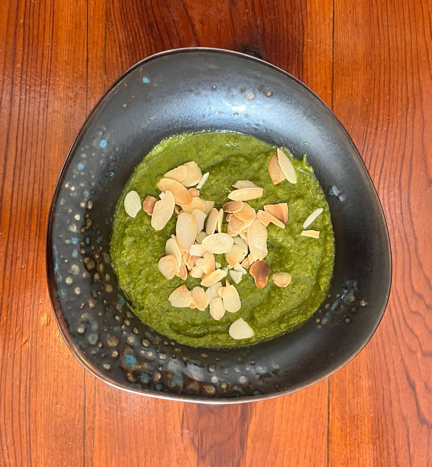 Alho poró, brócolos, cebola, batata doce e espinafre. Com amêndoas tostadas no topo.