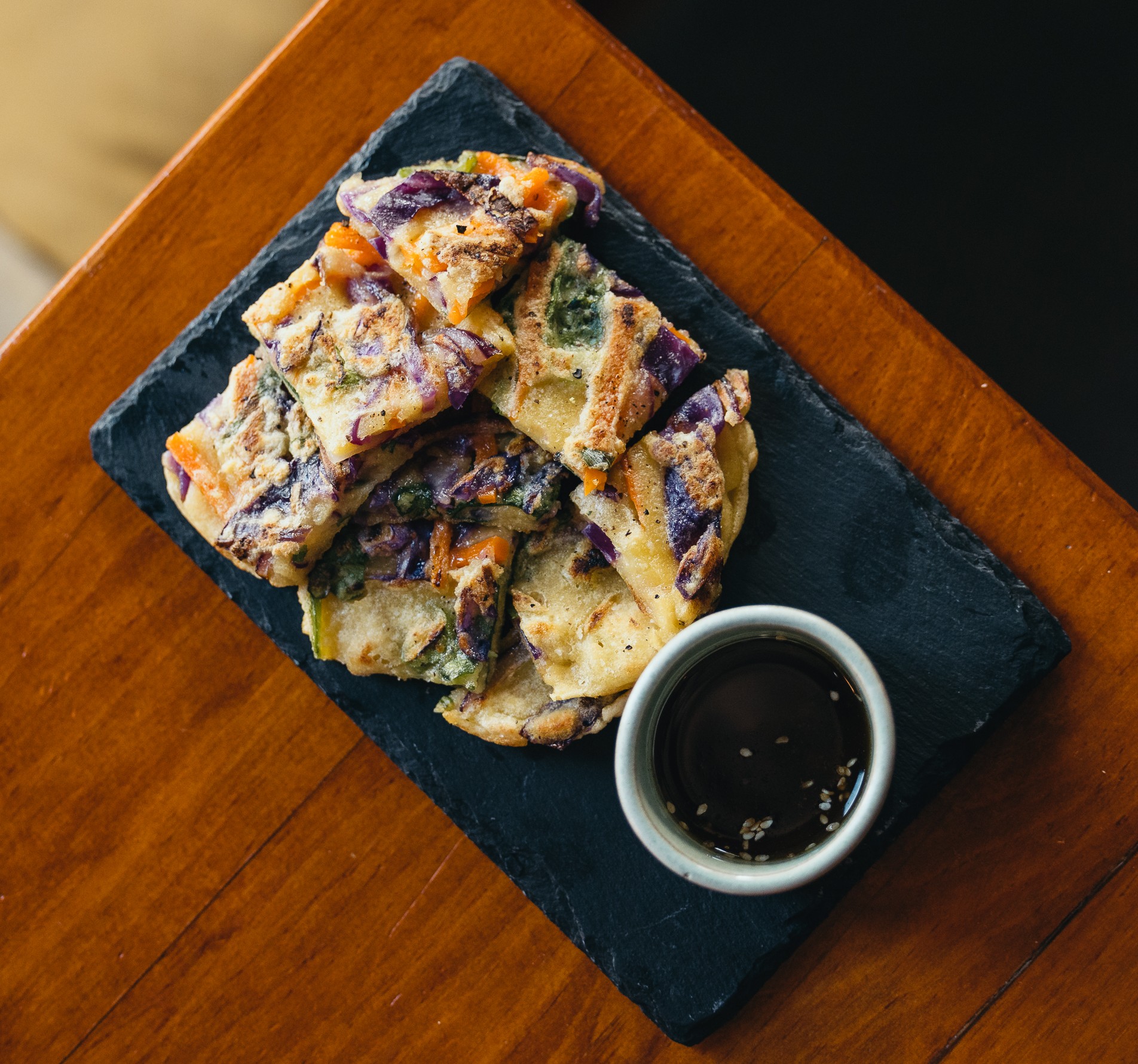 Crepioca recheada com espinafre, couve rouxa, cebolete, cebola, cenoura, alho e molho thai